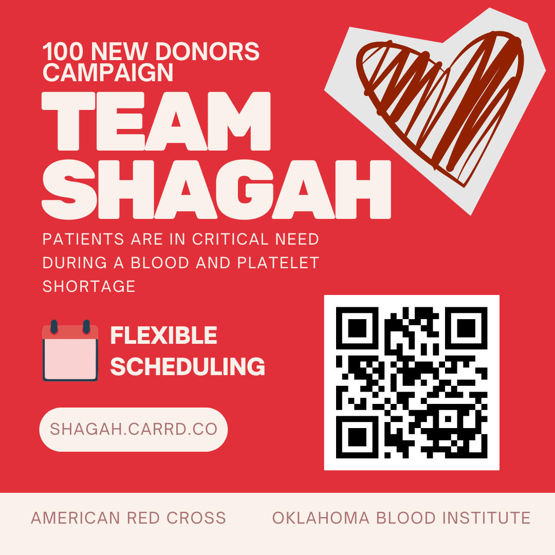 Shagah relies on weekly transfusions to keep her alive during treatment. There is a SEVERE SHORTAGE in Tulsa right now. If you are healthy and able, PLEASE donate regularly.